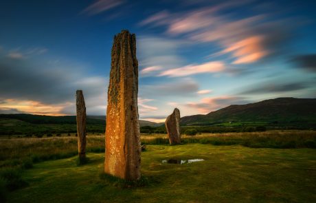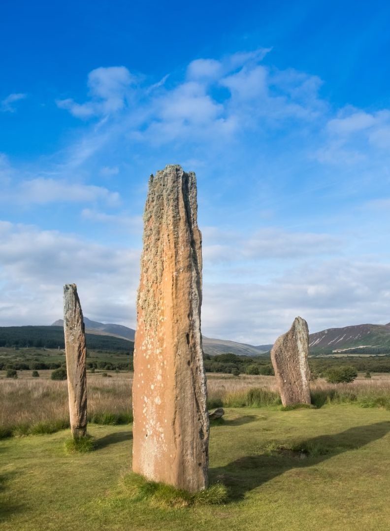 Your adventure continues with a gentle 1.2-mile pilgrimage on foot to the expansive quiet of Machrie Moor, where rolling fields open into a broad, windswept landscape crowned with ancient standing stones. As you walk the footpath toward the circles, the world around you seems to widen—sound stretching farther, the air growing clearer, and time itself loosening its grip. The stones rise unexpectedly from the moor, tall and solemn, each one shaped by both human hands and the relentless artistry of weather and centuries. Here, you’ll feel the land’s deep pulse beneath your feet, a steady presence that has held rituals, gatherings, and mysteries now lost to memory.